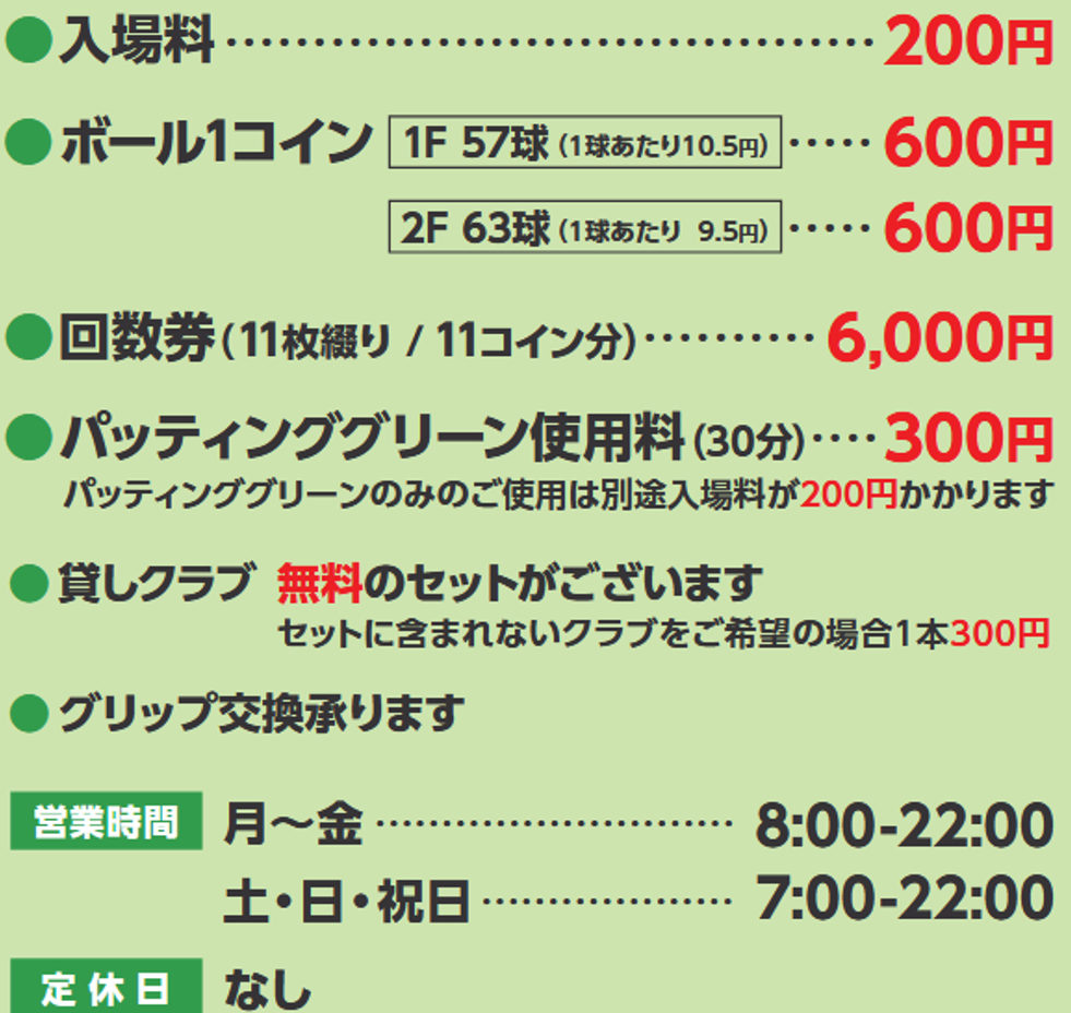 ☆パターをご利用のお客様、左打ちのお客様、プロのレッスンをご希望のお客様はお知らせください。