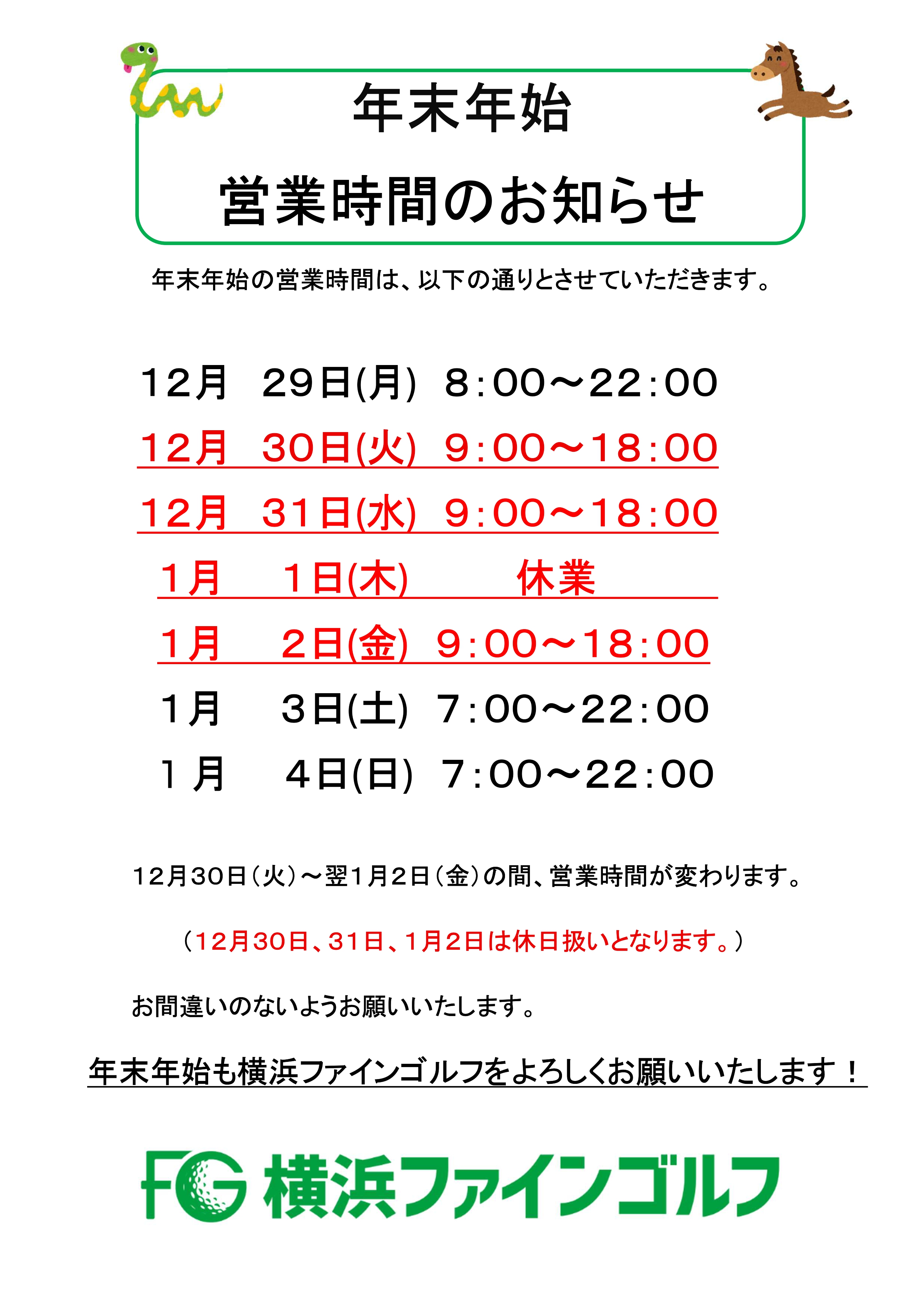 1月 4日(日) 7:00~22:00 休日年末年始も横浜ファインゴルフをよろしくお願いいたします。