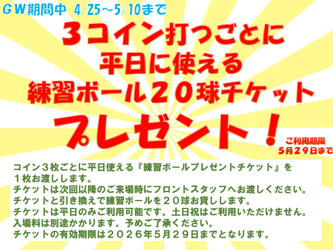 【GWキャンペーン】平日ボールプレゼント券配布【2026】